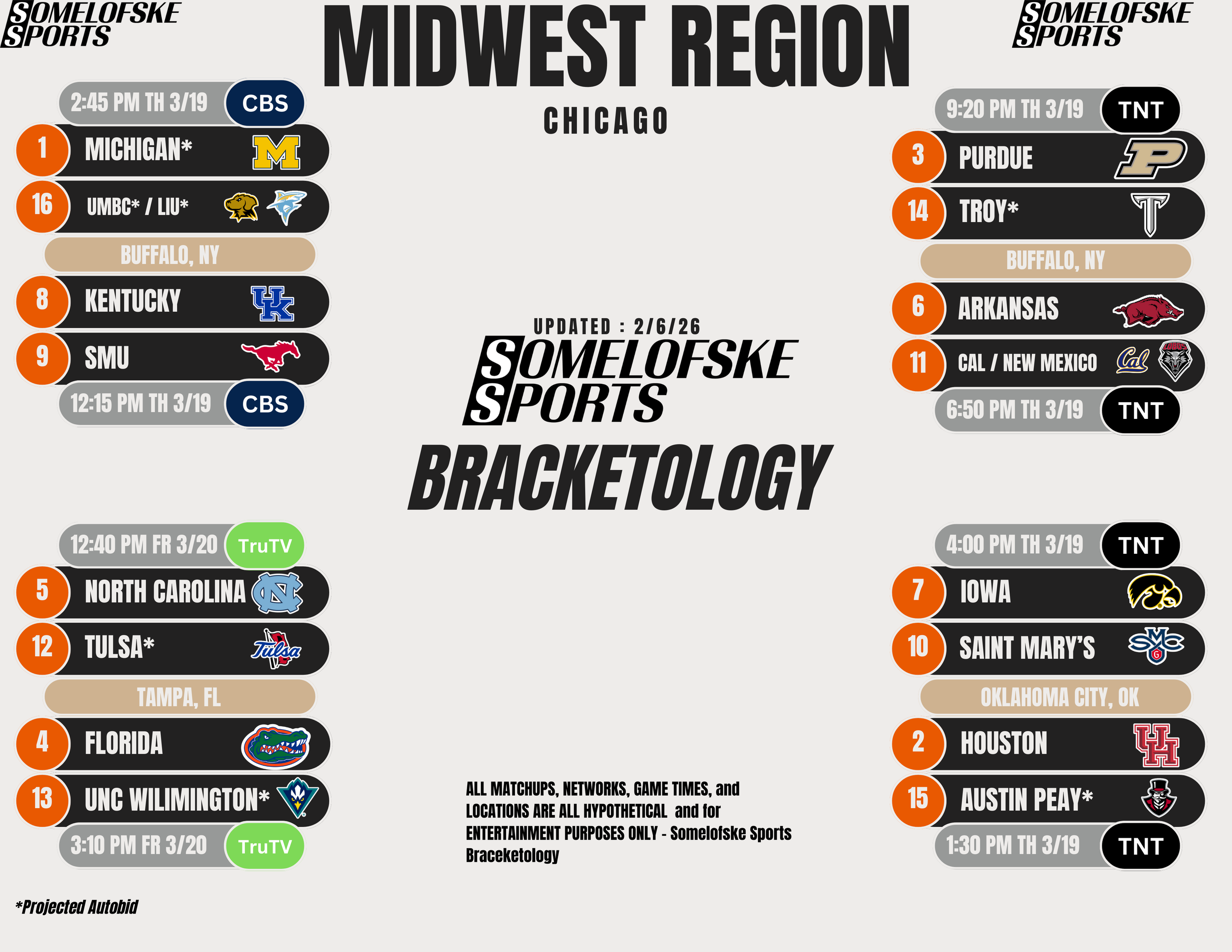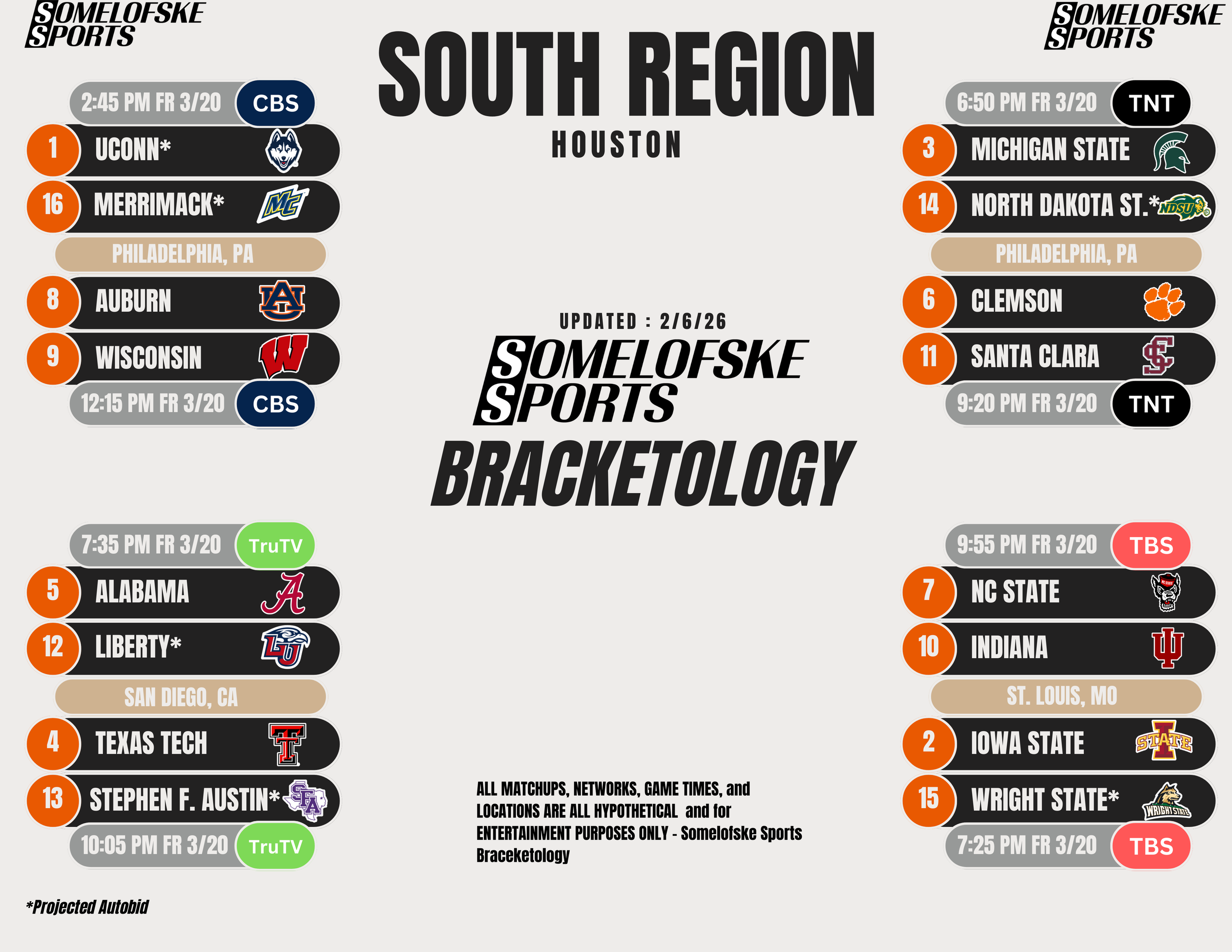 *Check out http://bracketmatrix.com/ for other bracketologists and the community consensus Previous Editions: Pre-season: 11/3/25 11/10/25 11/17/25 11/24/25 12/1/25 12/8/25 12/15/25 12/30/25 1/5/26 1/12/26 1/16/26 1/22/26 1/27/26 1/30/26 2/2/26