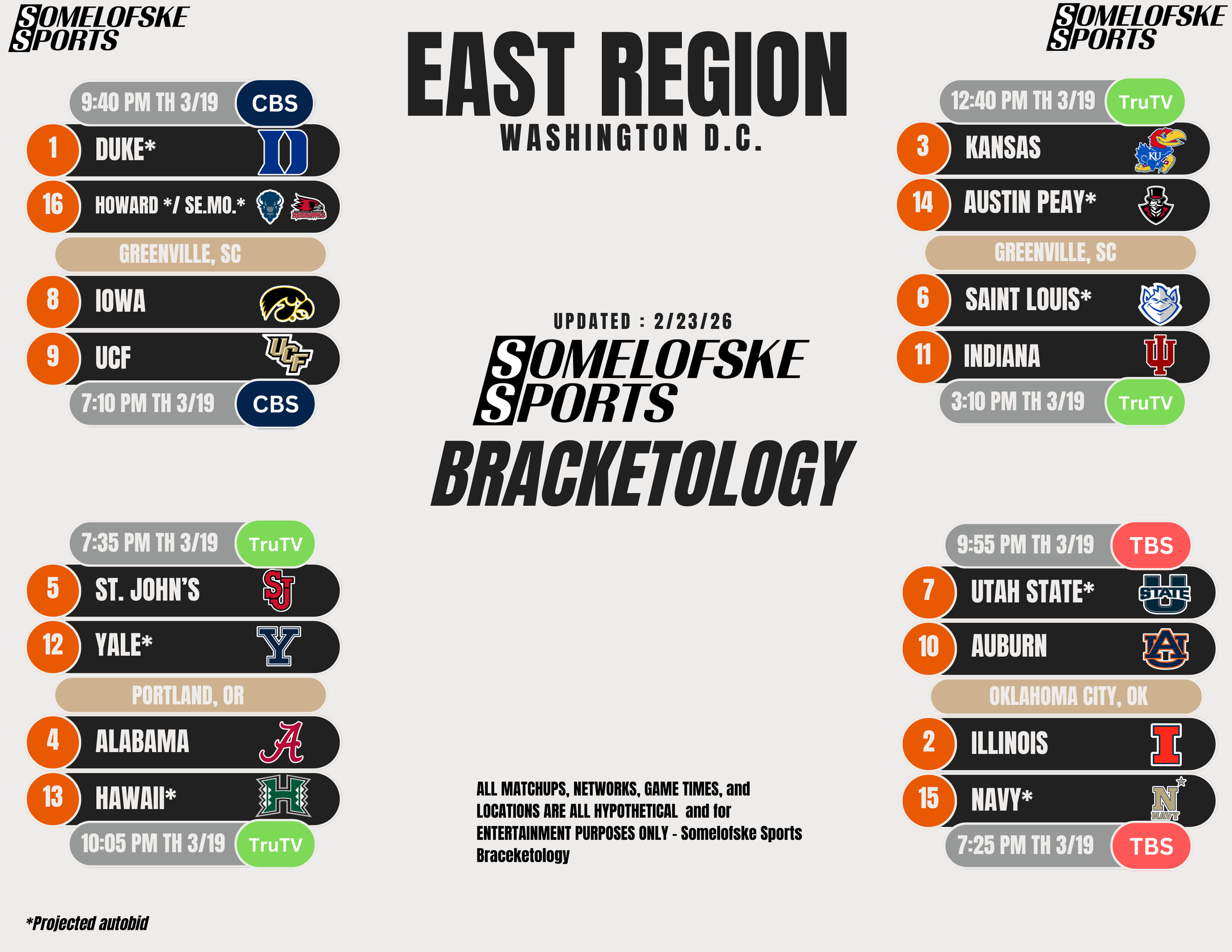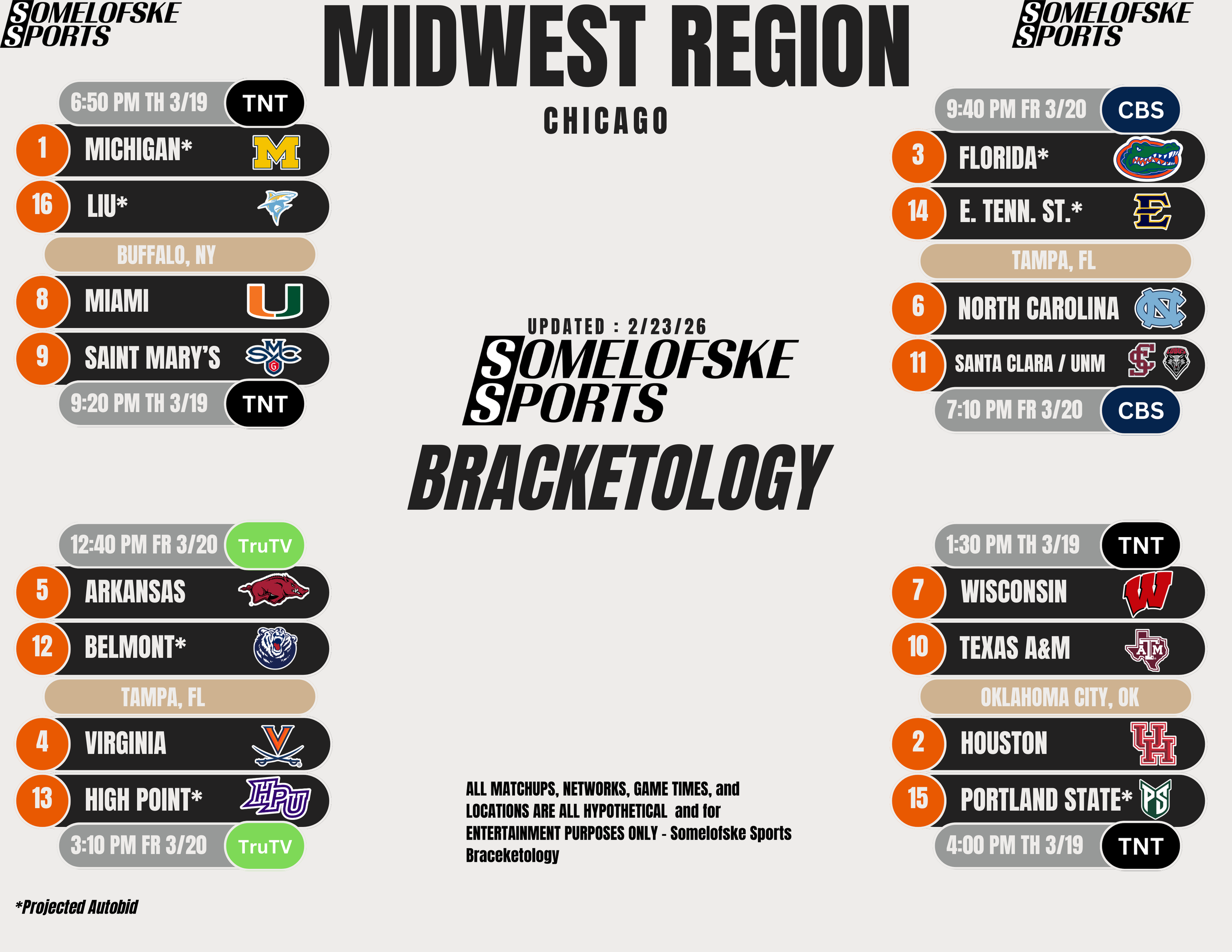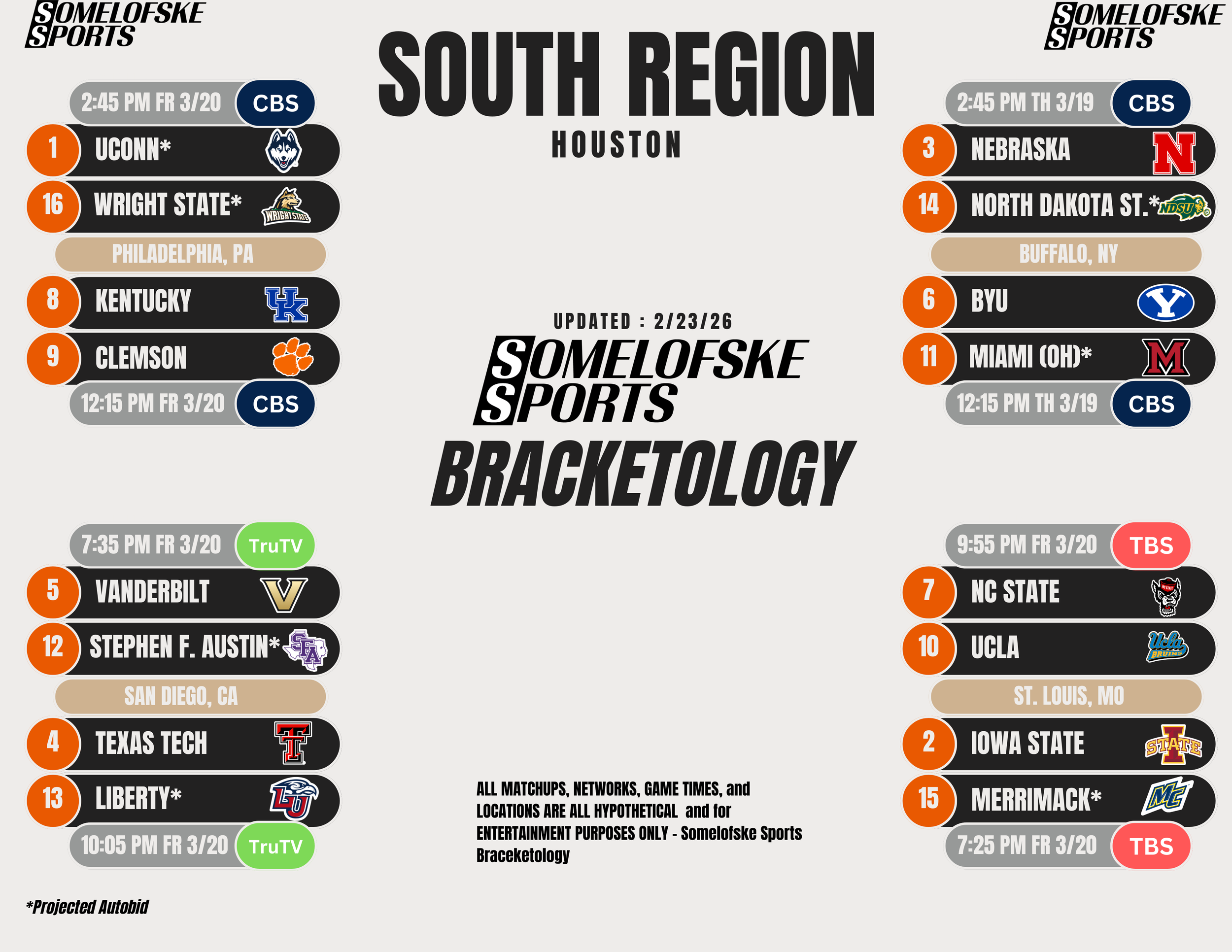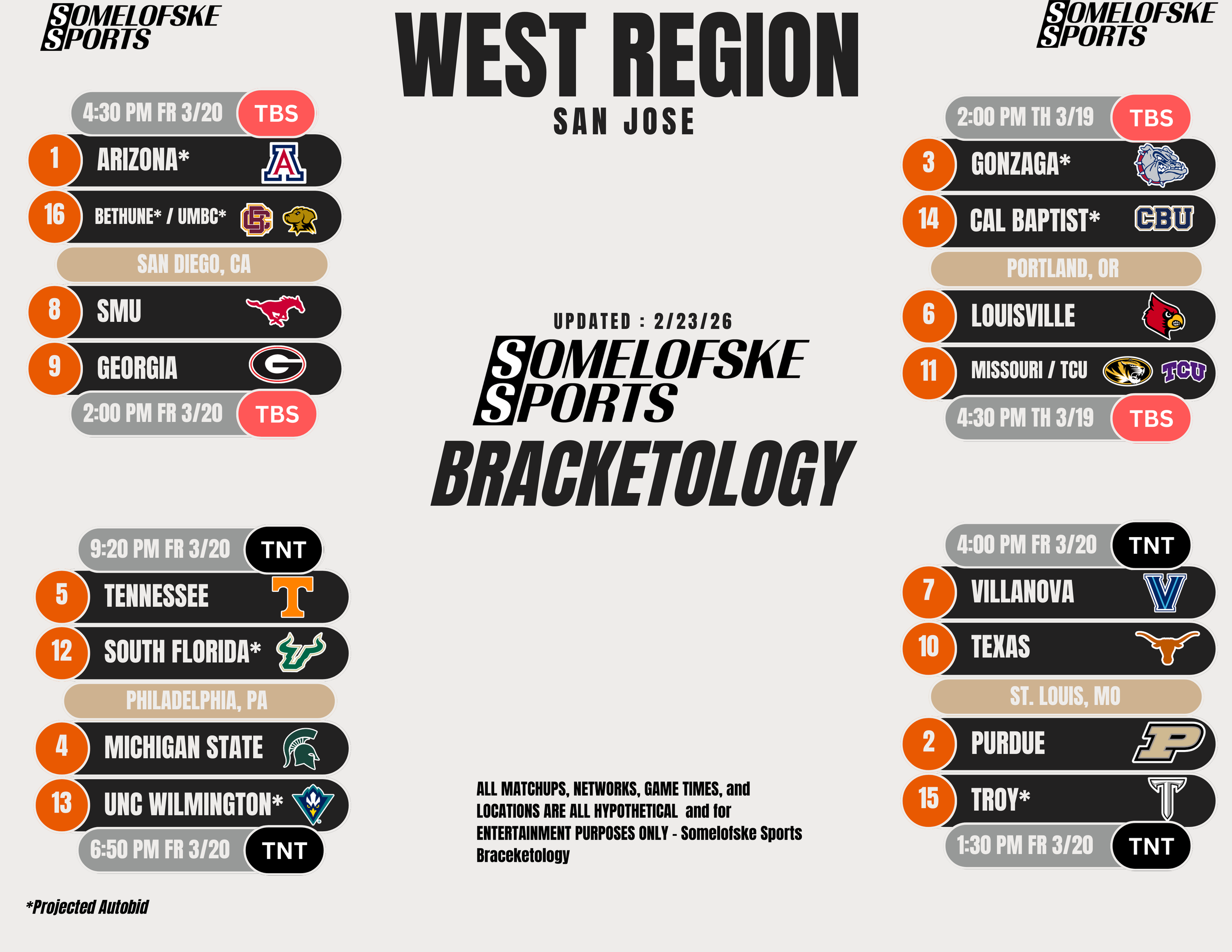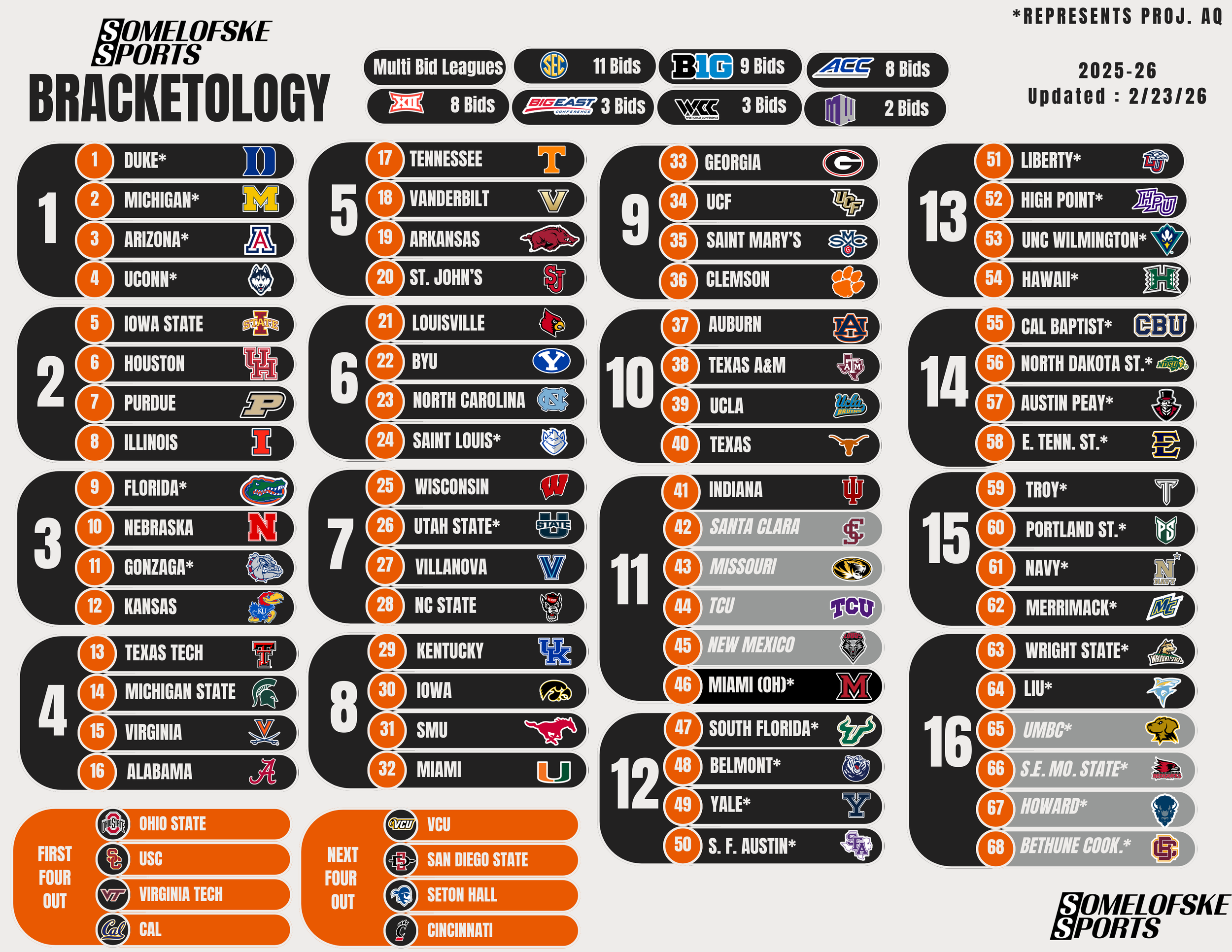 *Check out http://bracketmatrix.com/ for other bracketologists and the community consensus Previous Editions: Pre-season: 11/3/25 11/10/25 11/17/25 11/24/25 12/1/25 12/8/25 12/15/25 12/30/25 1/5/26 1/12/26 1/16/26 1/22/26 1/27/26 1/30/26 2/2/26 2/6/26 2/9/26 2/12/26 2/17/26 2/20/26
