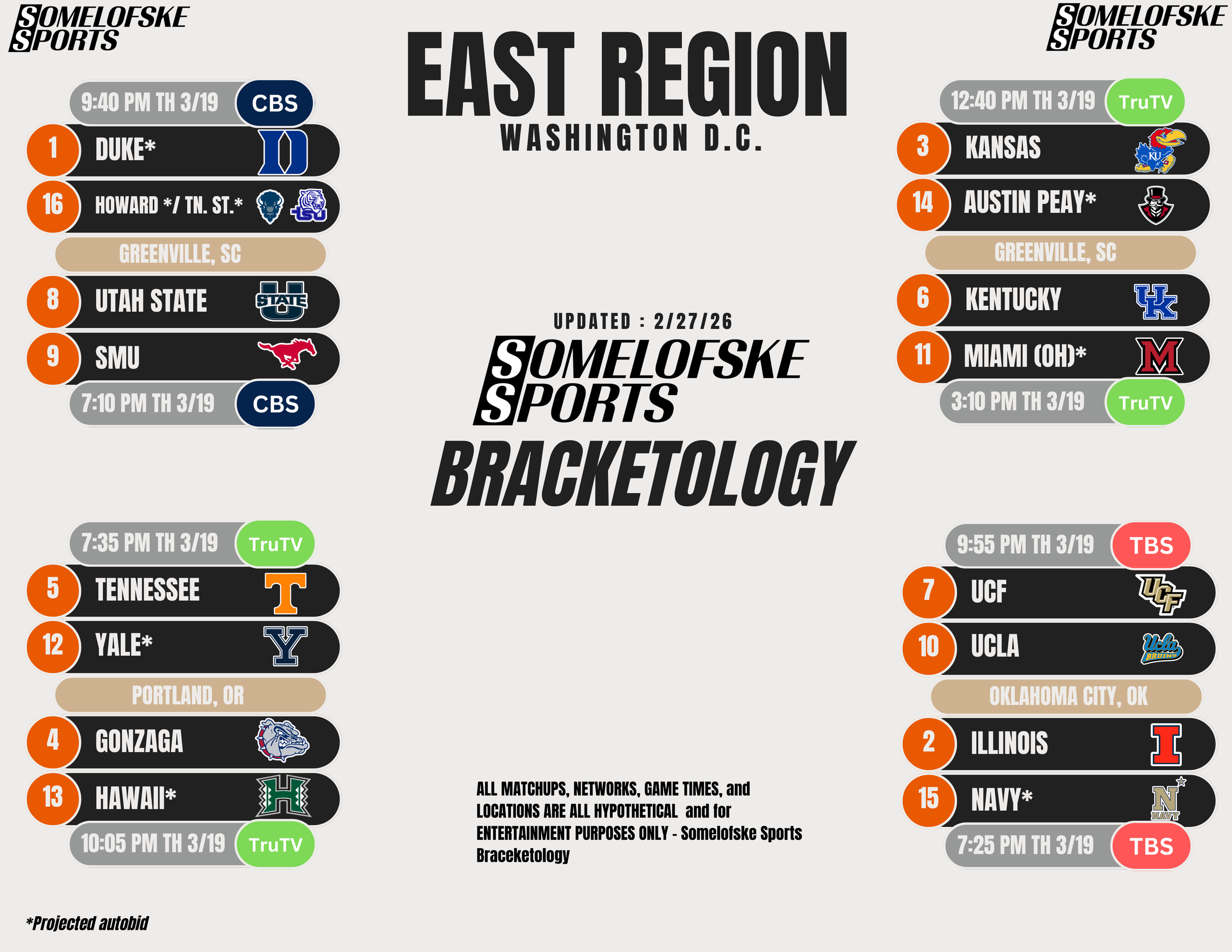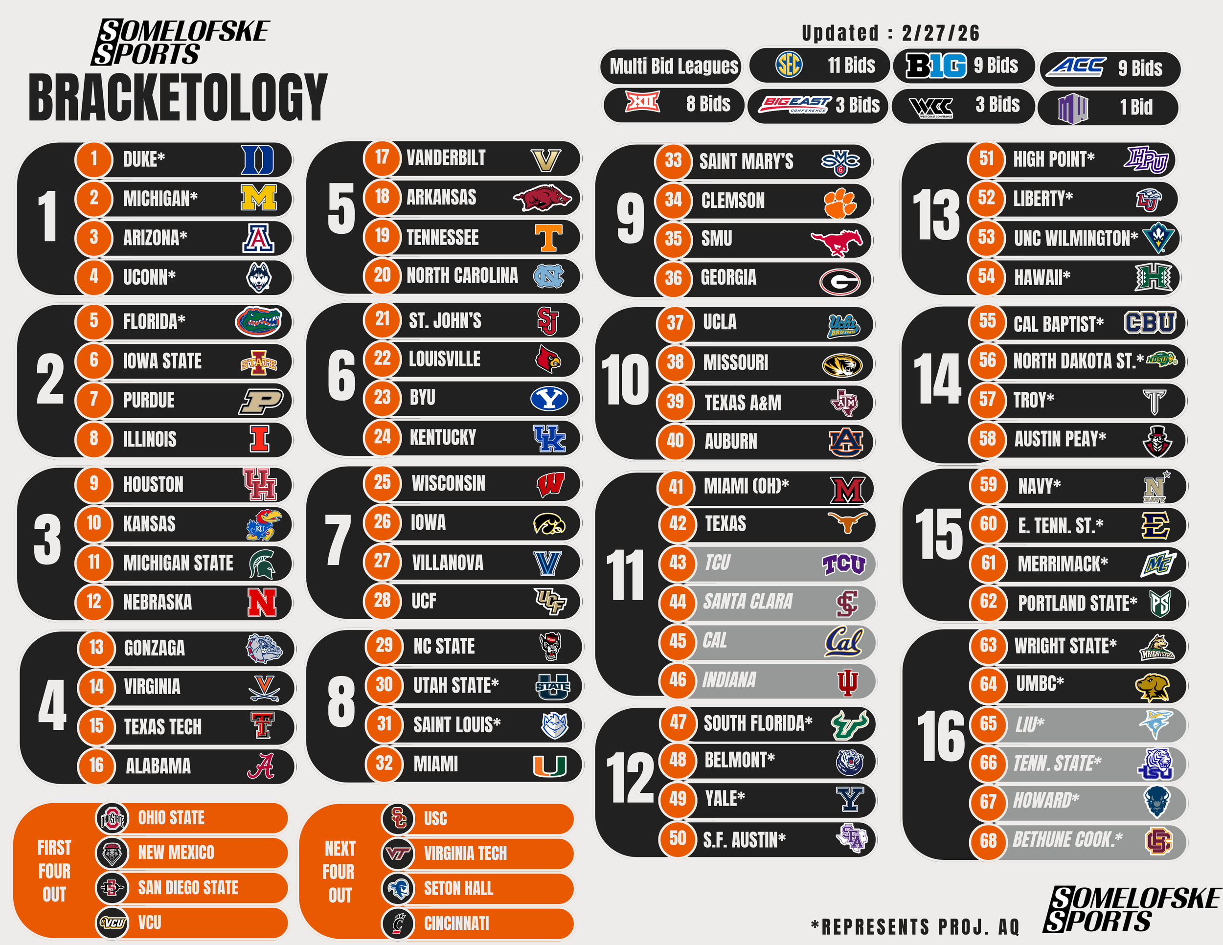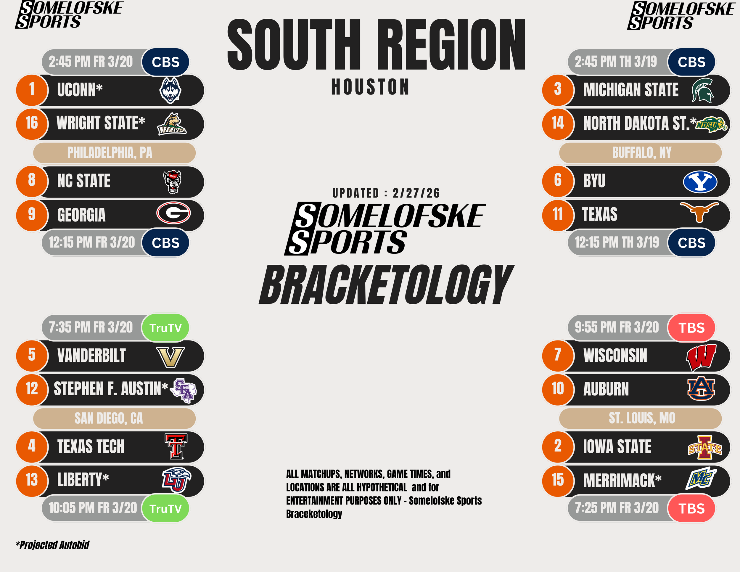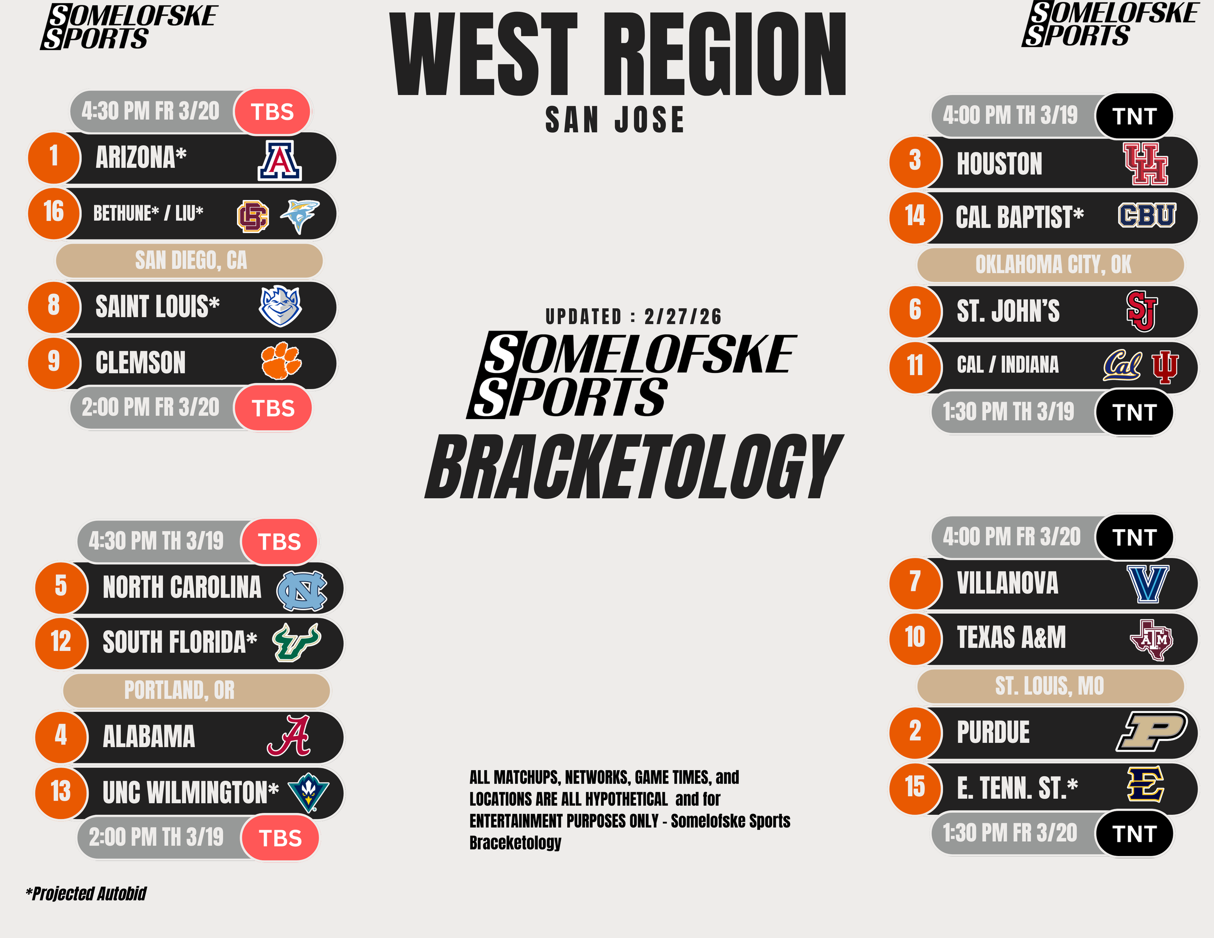 *Check out http://bracketmatrix.com/ for other bracketologists and the community consensus Previous Editions: Pre-season: 11/3/25 11/10/25 11/17/25 11/24/25 12/1/25 12/8/25 12/15/25 12/30/25 1/5/26 1/12/26 1/16/26 1/22/26 1/27/26 1/30/26 2/2/26 2/6/26 2/9/26 2/12/26 2/17/26 2/20/26 2/23/26